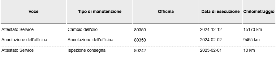 Inoltre riportiamo sia nel contratto, che nella fattura di vendita i chilometri percorsi. Importantissimo nell'acquisto delle auto usate richiedere al venditore lo storico manutenzioni con la relativa documentazione (libretto service - fatture diffidate da chi non ve li mette a disposizione.