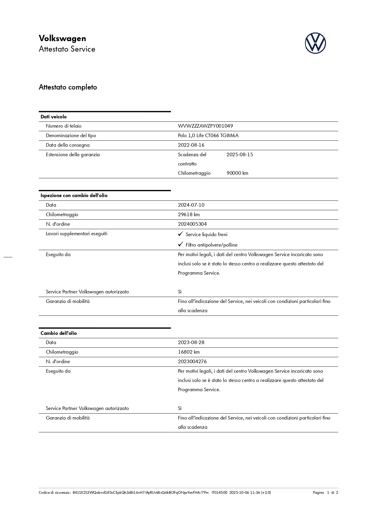 N. DI TELAIO: WVWZZZAWZPY001049 -