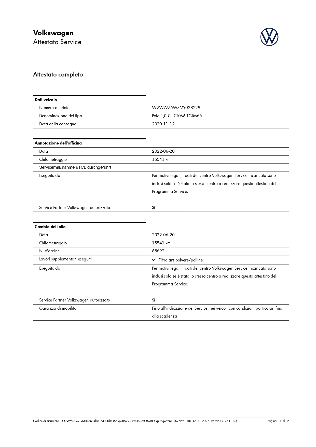 N. DI TELAIO: WVWZZZAWZMY028229 -