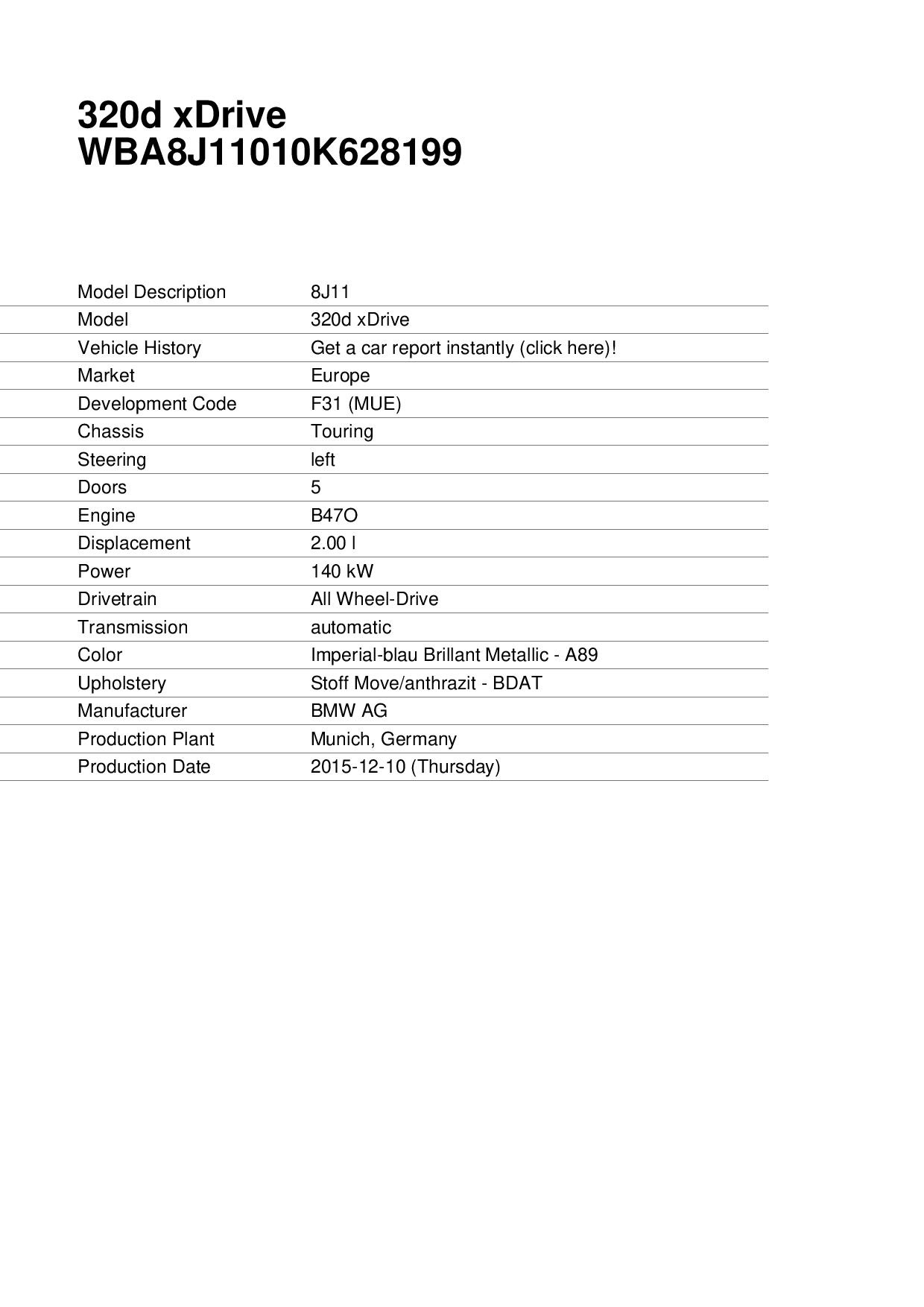 BMW 320d 190cv xDrive Touring Restyling motore B47, Cambio automatico a 8 rapporti, Euro6, anno 02/2016, km 92563 Certificati con relativo storico manutenzioni, Colore Imperialblau Metallic, Luci diurne LED, Gruppi ottici posteriori LED, Volante multifunzione in pelle, Sistema di NAVIGAZIONE BMW BUSINESS monitor da 6,5”, Computer di bordo, Cruise control, Sensore Luci e Sensore Pioggia, Climatizzatore automatico, Bracciolo anteriore retraibile, Portellone con apertura e chiusura elettrica, Sensori di parcheggio POSTERIORI con VISUALIZZAZIONE GRAFICA SUL DISPLAY, Modanature esterne nere opache, Modanature interne argento opache, Battitacco anteriori neri con scritta BMW, Selettore modalità di guida (EcoPRO, Comfort, Sport), Controllo dinamico di stabilità DSC con ABS e DTC, Chiamata SOS di emergenza intelligente, Cerchi in lega da 17", VETTURA ITALIANA UniProprietario NON FUMATORE