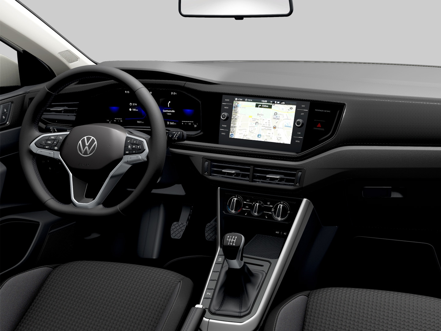 Sedili in tessuto con motivo "Life" e volante multifunzione in pelle, per un'esperienza di guida curata nei dettagli.